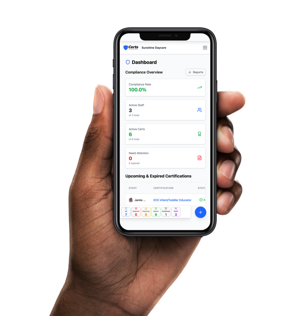 When your daycare uses Certs by Abrakiddabra, you know they’re on top of every requirement. No missed renewals, no expired credentials — just the reassurance that your child is in a well-run, compliant environment.